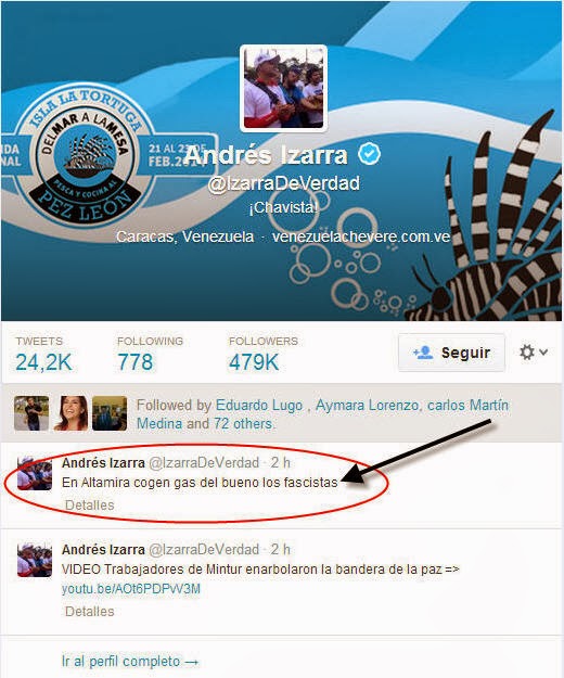Andrés Izarra, ex ministro de Información y Comunicación, y actual titular de la cartera de Turismo, dejó asentado en su cuenta de Twitter lo que es su impresión de los enfrentamientos entre manifestantes y funcionarios del orden público en Altamira.